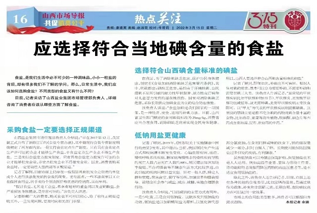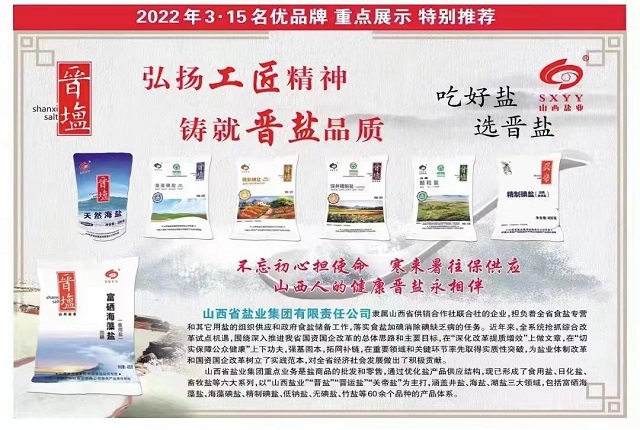 多年来,华体平台牢记初心和使命,大力配合市场监管部门,严防、严管、严控食盐安全风险,保障全省食盐的质量安全和供应安全,将“诚信315,放心365,以诚筑信,品质为先,盐出必行”的社会形象深入到百姓心中。盐业集团温馨提示广大消费者,为了您和家人的身体健康,请从正规渠道购买食盐。“晋盐”是您放心、健康、值得信赖的选择。
