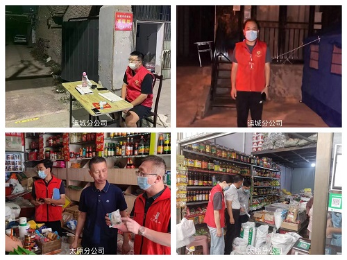 运城、晋中、太原、晋城、阳泉等分公司立即启动食盐保供应急预案,第一时间向各县级公司、各批发配送部负责人发送疫情防控紧急通知,要求各区域负责人及时关注疫情动态,科学防控,充足食盐储备,确保供应稳定。积极动员广大党员干部担当作为,投入到抗疫保供工作中,确保疫情期间食盐市场供应不涨价、不断货、不脱销,及时回访随时配送,并要求各区域做好强降雨天气应对防护工作,保障经营安全。抽调专人积极协助周边社区开展疫情防控工作,做好查验场所码、行程码、健康码、测温、出入登记等工作,保证24小时坚守防“疫”一线,同时积极向居民认真宣传防“疫”知识,做好政策讲解,坚决筑牢疫情防控防线。