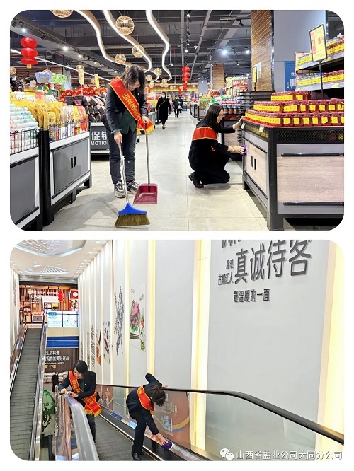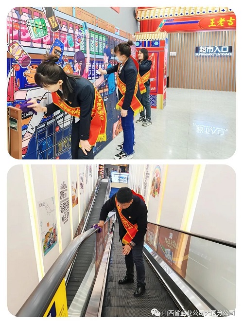 大同盐业的志愿者们以服务客户为初心,为给顾客营造一个干净整洁的购物环境,志愿者们不怕脏不怕累,在古都汇超市认真仔细的清洁展柜、清扫地面、清理储物柜、擦拭扶梯,充分发挥了党员的无私奉献精神,用实际行动传递和践行着雷锋精神。