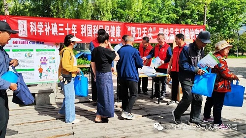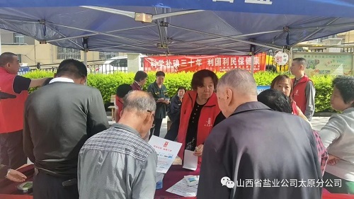 在杏花岭区会场,太原分公司携手山西省营养学会、山医大二院营养科、山医大二院社区一起走进社区,公司领导与营养专家结合如何合理膳食,共同为市民解答坚持科学补碘的重要性。