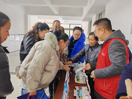 在会议厅外面,大同分公司设立了食盐品种展示区,工作人员解答和介绍各种盐产品,发放宣传资料和2克定量盐勺。
