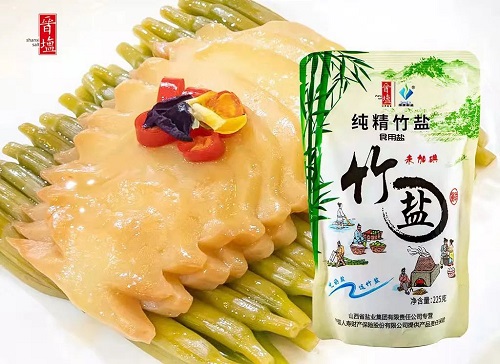 竹盐选取三年生壮年竹材,装入日晒海盐,用松木高温烧制,鲜竹的精华成分触入盐品,增加了人体所需的钙、镁、铜、铁、锌、硒等微量元素,颗粒均匀、碱性、熟盐、保留竹香味及海盐鲜咸味、易溶解,是不可多得的珍贵竹盐。